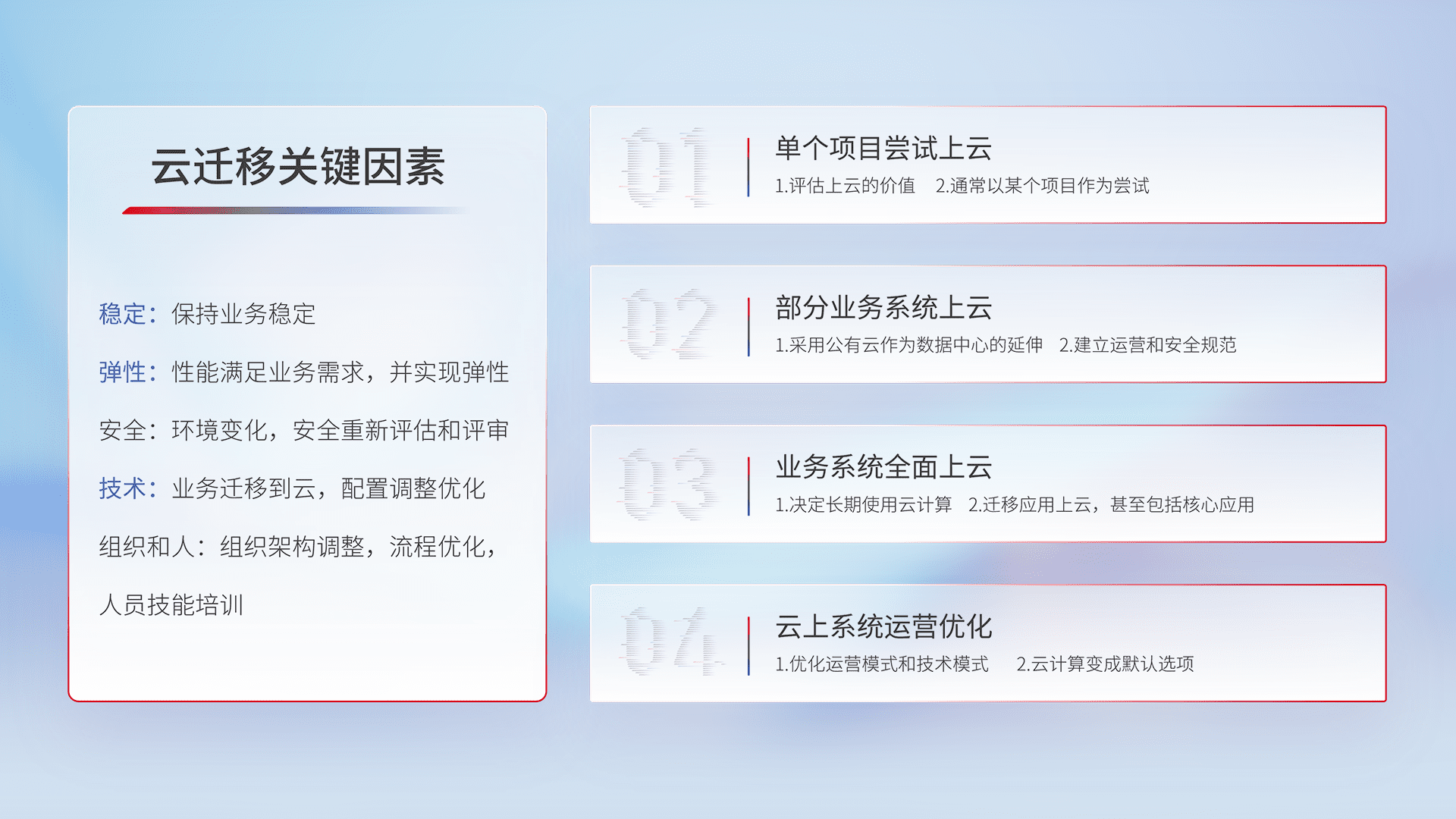 结合实际业务,,从规划设计、、、、云平台选型、、、、云原生改造、、、数据迁移、、集成交付,,,,迁移全过程为客户识别最佳上云路径,,,,做好风险识别管理,,,,设计网络架构、、、、身份权限、、、、安全审计合规、、、、操作审计、、、、日志审计、、监控告警策略、、、多站点容灾设计等,,对云上基础设施进行整体规划,,提升IT治理水平,,,以满足弹性、、、高可用、、、高性能的需求。。。
